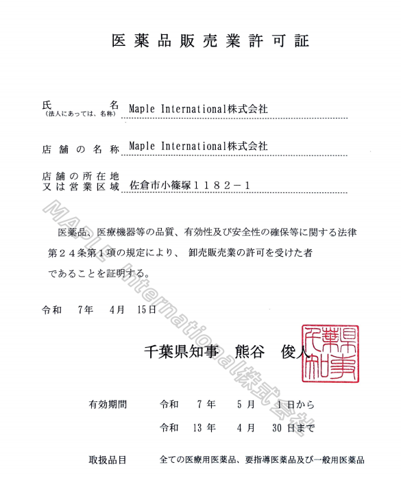 医薬品卸売販売業資格取得のお知らせ 2025 10/23 information 2025年10月23日 令和7年05月01日付にて医薬品卸売販売業の資格取得を致しました。下記の取り扱いが可能です。 全ての医療用医薬品、要指導医薬品及び一般用医薬品 以上となります。 information 倉庫業登録取得のお知らせ 医薬品販売業資格取得のお知らせ