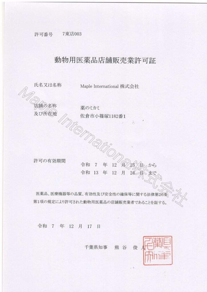 動物用医薬品店舗販売業許可証