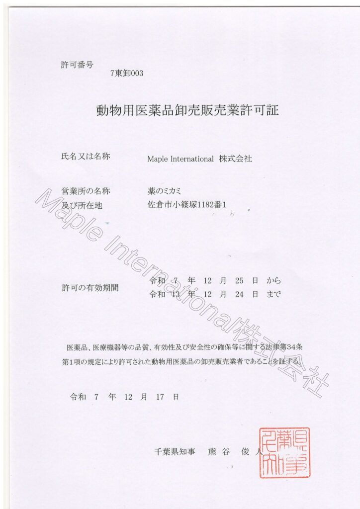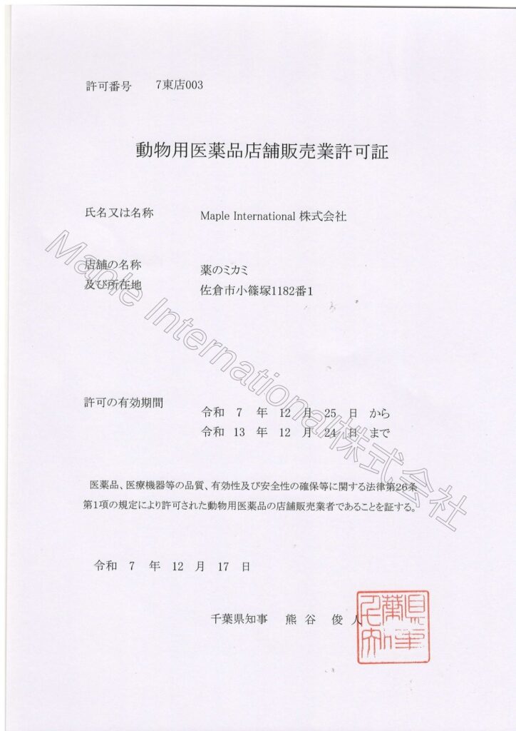 As of December, Reiwa Year 7, we have obtained licenses for the wholesale and retail sale of veterinary medicinal products.